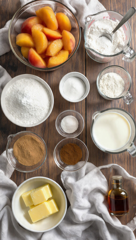 - Granulated sugar: 1 cup total, divided, sweetens both the peaches and the batter.