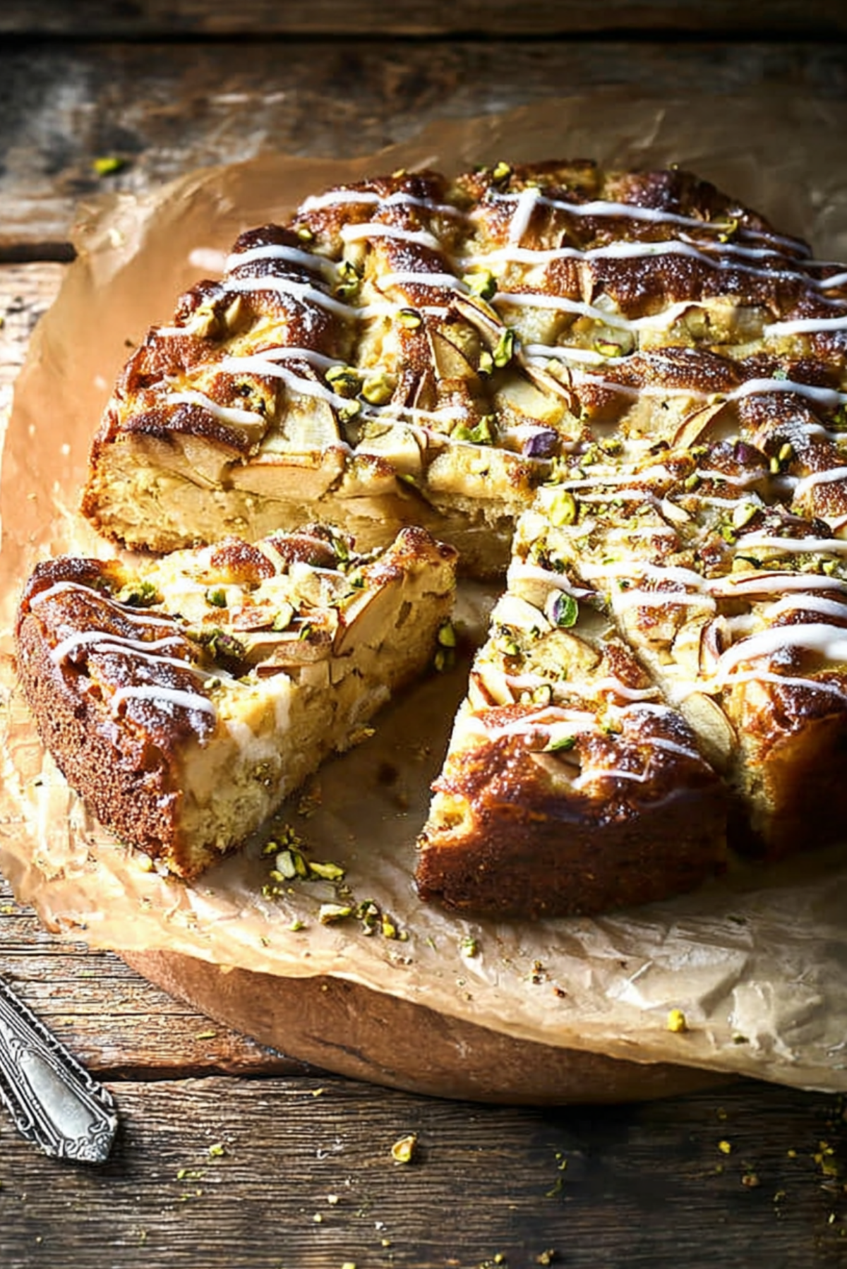 Presentation matters. Dust the top with powdered sugar right before serving, or decorate with thin apple slices and extra pistachios. Serve on a rustic wooden board with a linen napkin for that cozy homemade vibe.