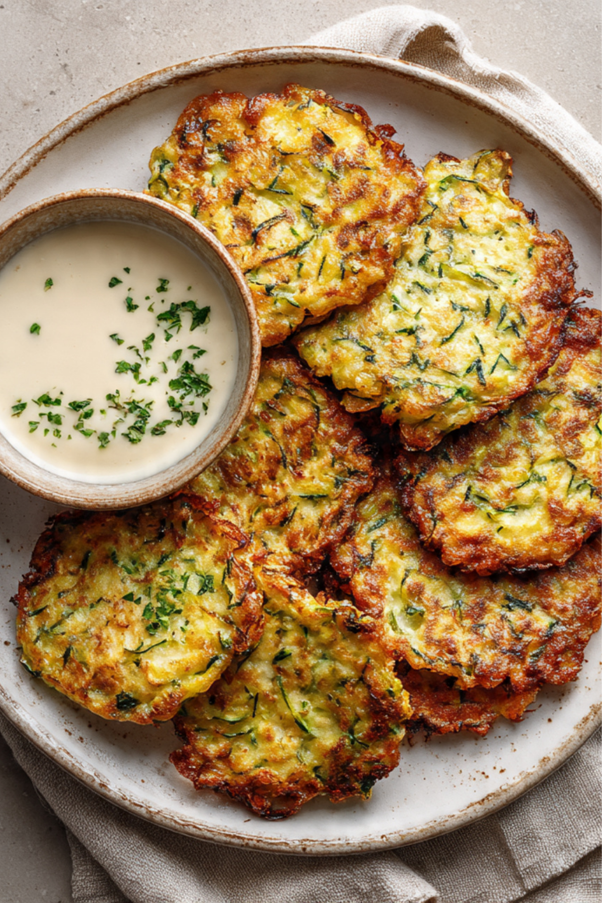 Fritters can be made ahead and stored in the fridge for up to 3 days. Reheat in a skillet over medium heat or pop them into a toaster oven to bring back that crunch. They also freeze well — just place parchment between layers and reheat straight from frozen.