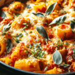 A cozy and creamy pasta bake featuring a luscious pumpkin tomato sauce, melty cheese, and fragrant herbs. This comforting dish blends the sweetness of pumpkin with the tanginess of tomato for a perfect family dinner.