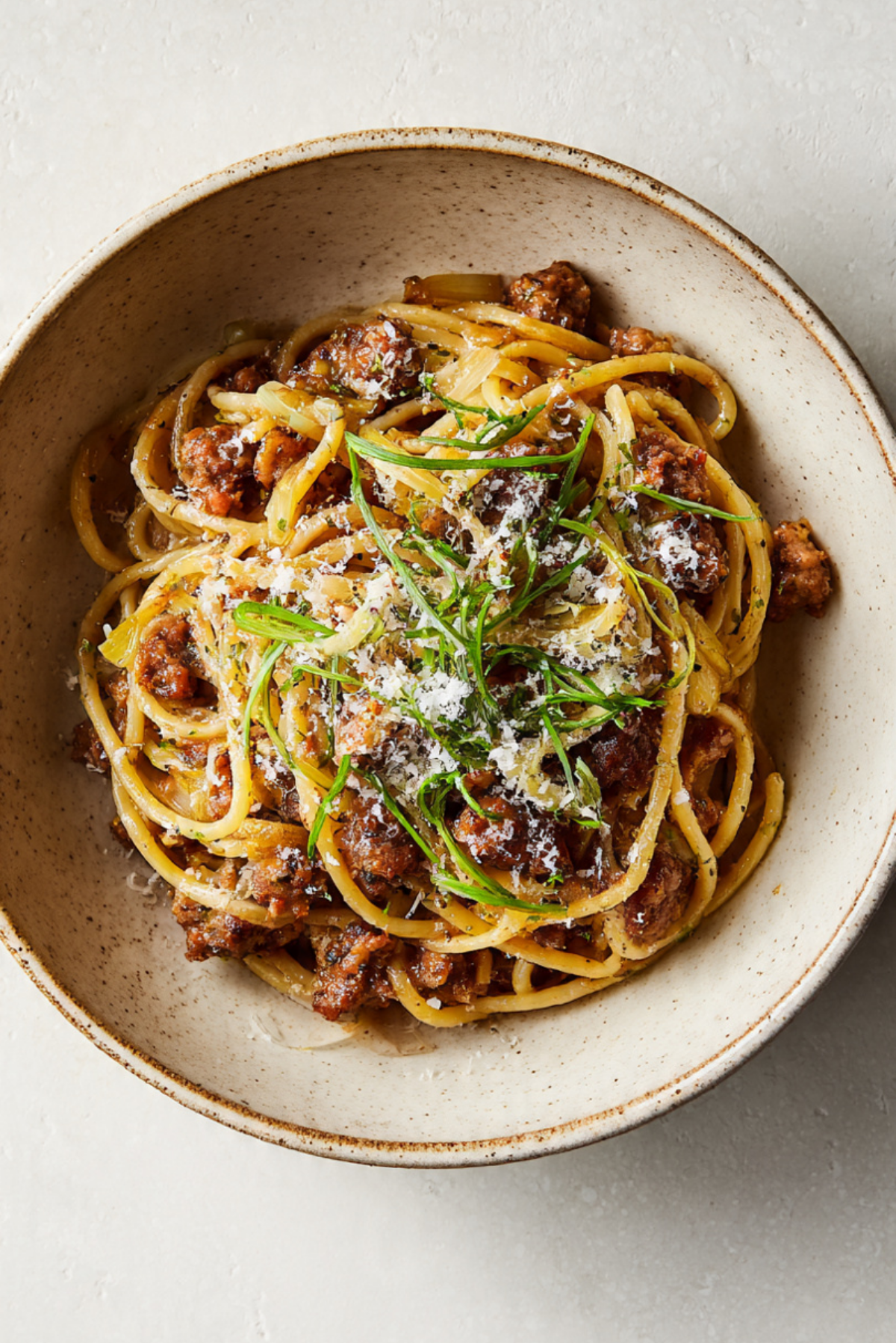 A comforting bowl of pasta with savory sausage, tender fennel, and melted pecorino cheese.