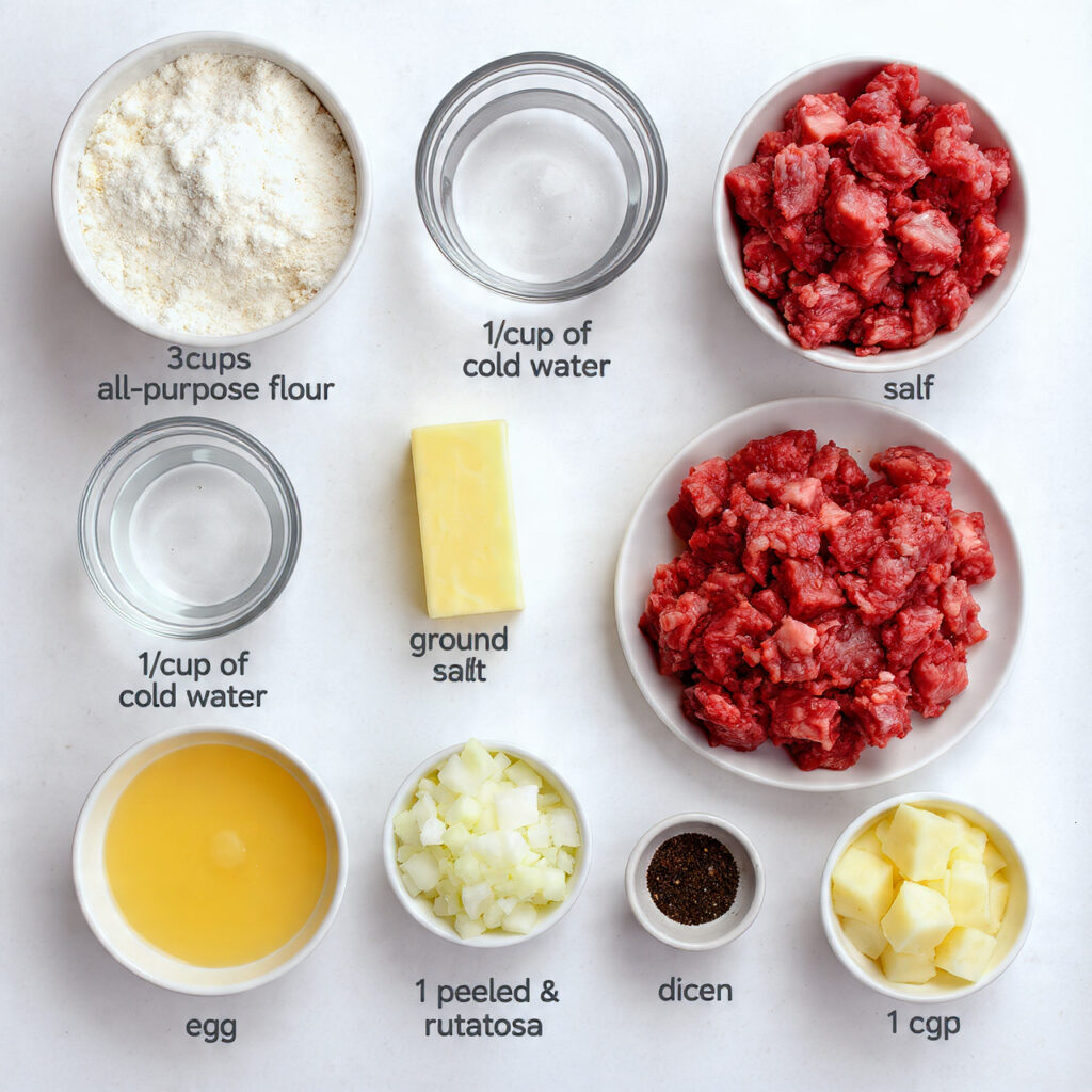 - Mix ground beef, diced potatoes, onion, rutabaga, salt, and pepper in a separate bowl.