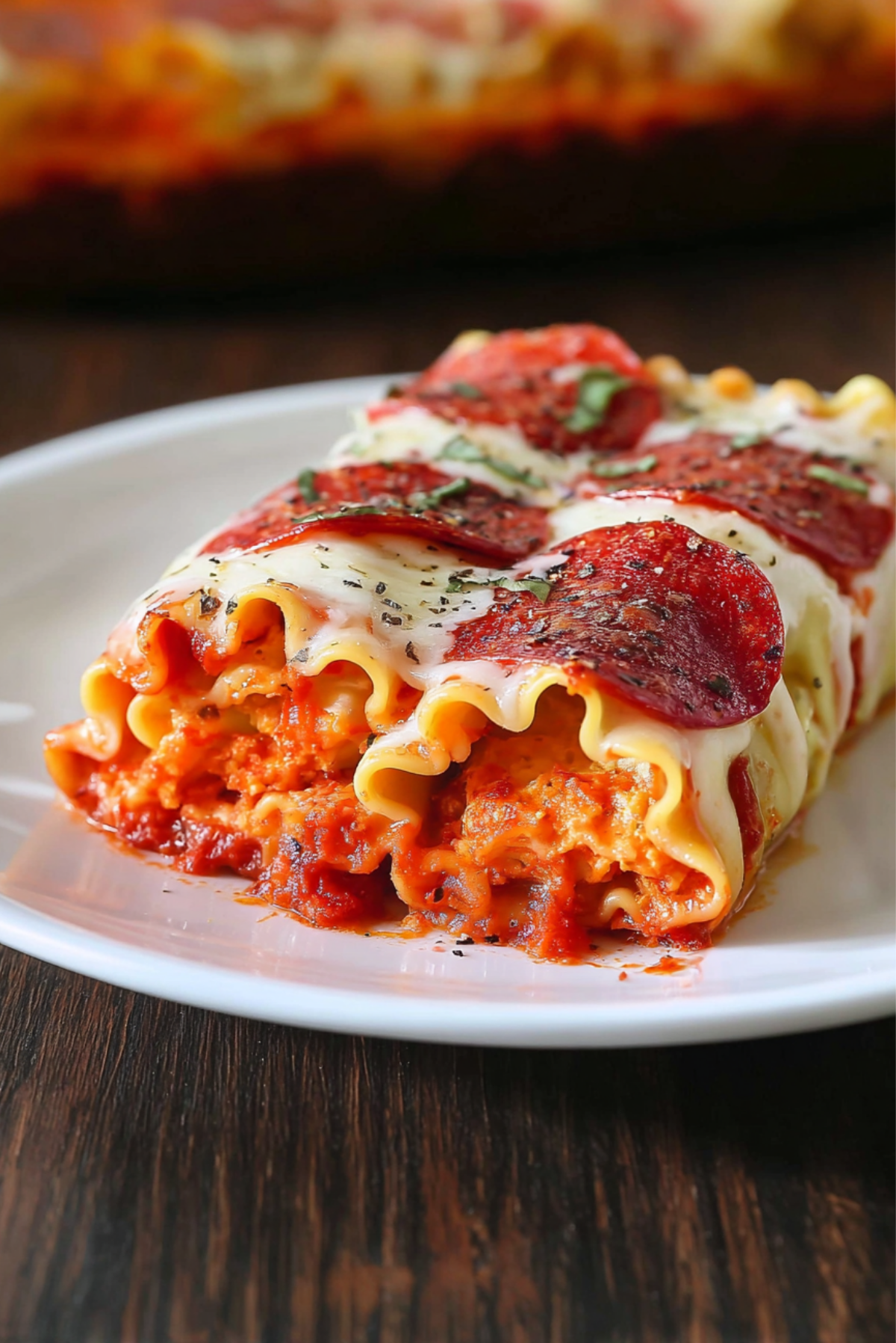 Cheesy lasagna noodles rolled around a ricotta and mozzarella filling, layered with marinara and pepperoni, baked until golden and bubbly for a fun pizza inspired dinner