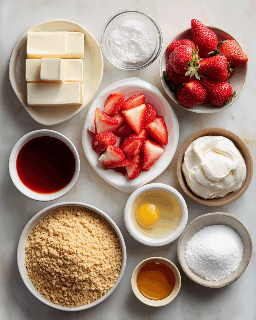 The magic of this dessert lies in the layers. The crust is buttery and crumbly, the cheesecake layer is silky and tangy, and the strawberry topping adds a juicy sweetness that ties everything together. Each bite feels light yet indulgent, creamy yet refreshing.