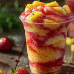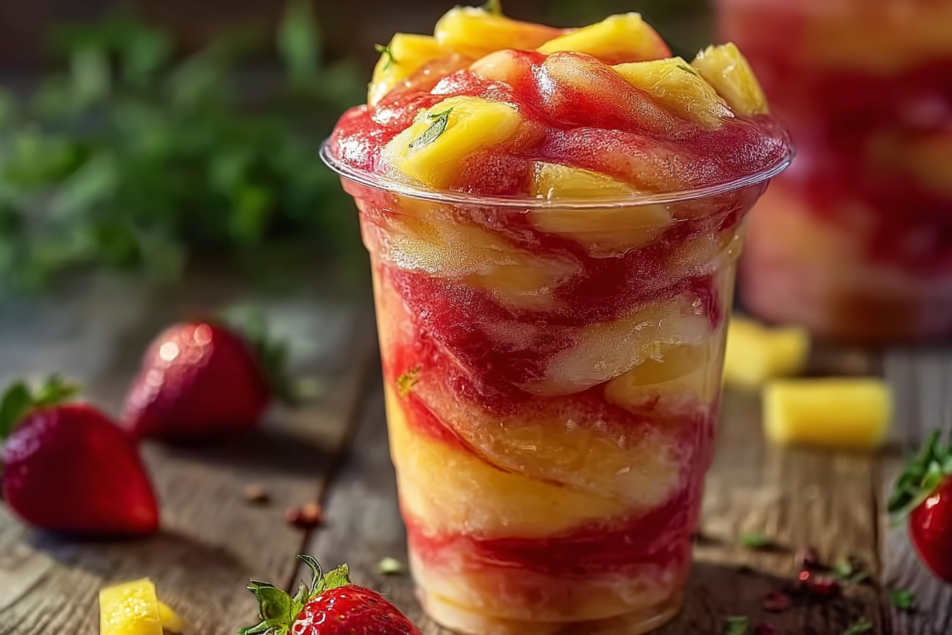 A refreshing summer drink made with layers of pineapple and strawberry slushies, creating a vibrant tropical swirl that’s as beautiful as it is delicious.