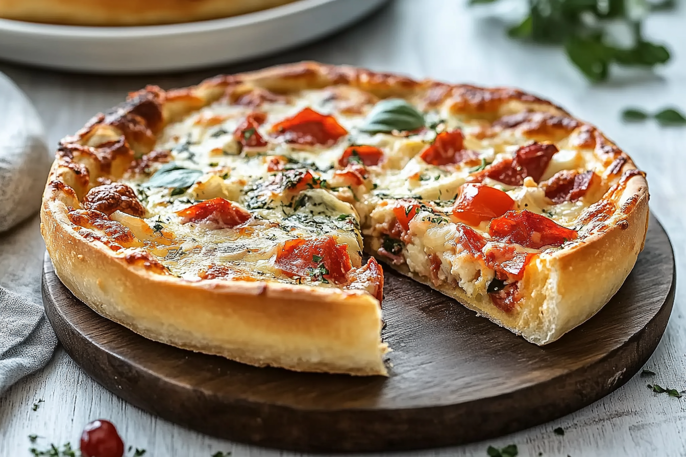 Serve pizza rustica on a wooden board garnished with fresh parsley and a drizzle of high-quality olive oil. Pair with a rustic red wine or sparkling water with lemon for a complete Italian-inspired feast.