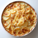 A comforting baked dish made with thinly sliced potatoes layered in a creamy garlic sauce and finished with melted cheese until golden and tender.