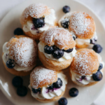 Profiteroles have their roots in classic French pastry, traditionally filled with cream and often finished with chocolate. Over time, home cooks and pastry chefs alike started playing with fillings, and fruit infused creams became a favorite. Adding blueberries brings a subtle tang and a soft purple hue, giving this dessert a modern, fresh personality while still honoring its timeless origins.