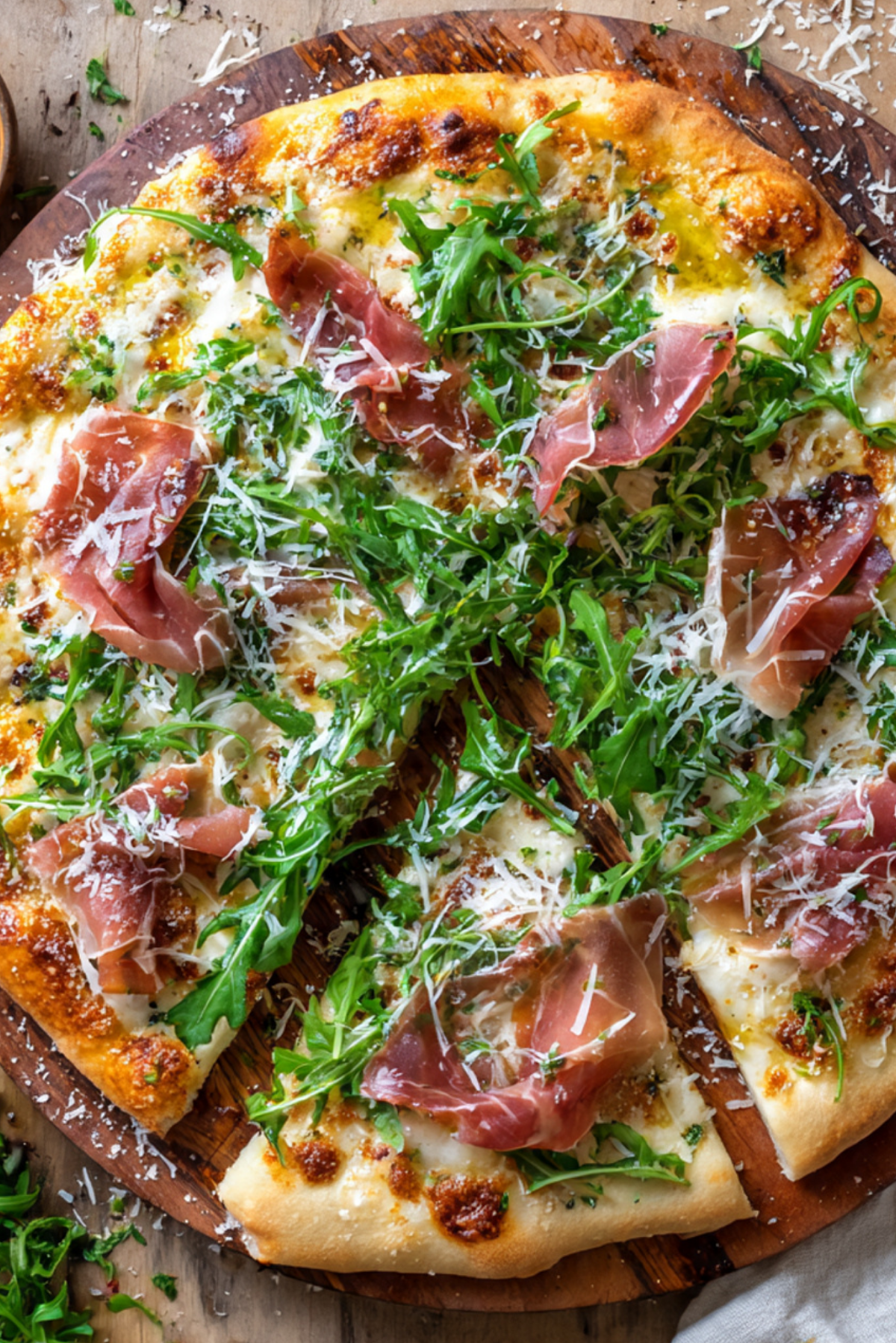 A simple yet elegant pizza topped with salty prosciutto, fresh arugula, melted mozzarella, and shaved parmesan on a crispy thin crust. Perfect for weeknight dinners or entertaining guests.