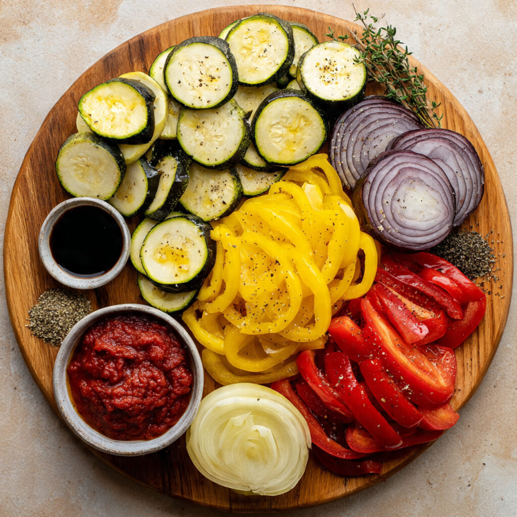 - Arrange sliced vegetables in alternating layers or a spiral pattern over the tomato base.