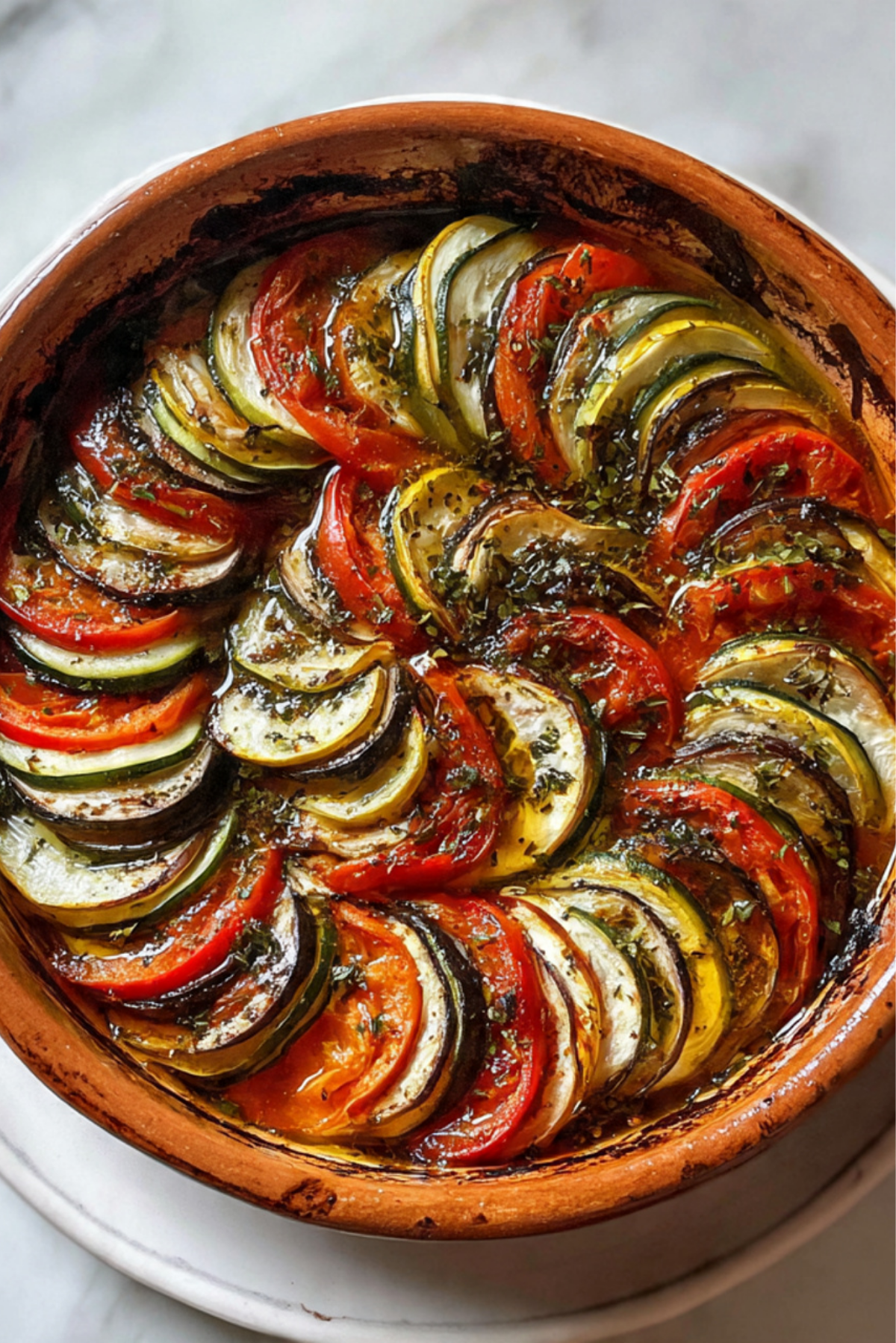 A beautiful medley of thinly sliced vegetables layered over a rich tomato base and roasted to perfection. This classic French Ratatouille is healthy, hearty, and full of bold Mediterranean flavors.