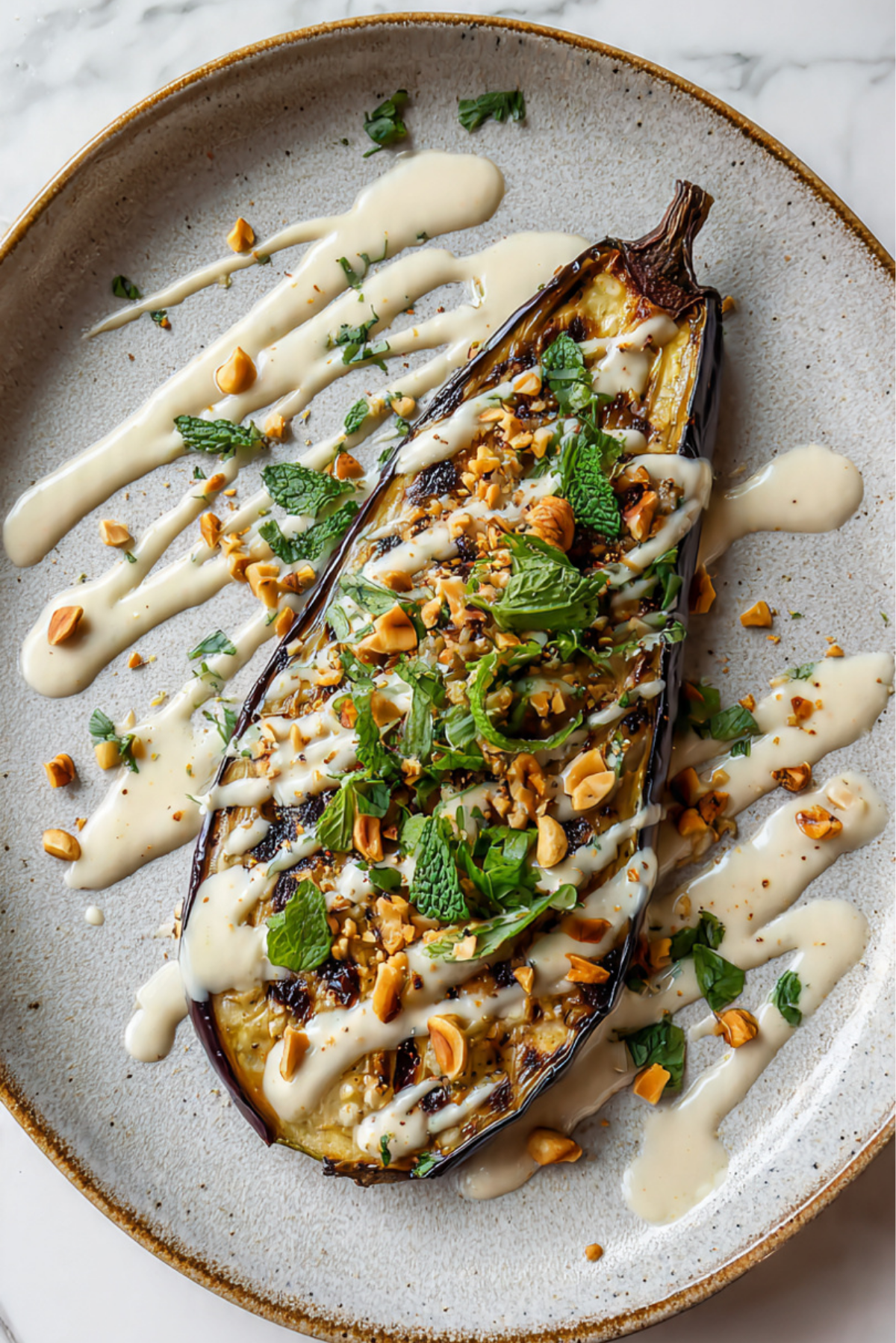 A silky, roasted aubergine dish topped with creamy tahini dressing and toasted hazelnuts, bursting with Middle Eastern flavor and textural contrast.