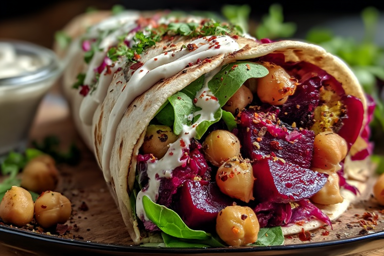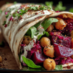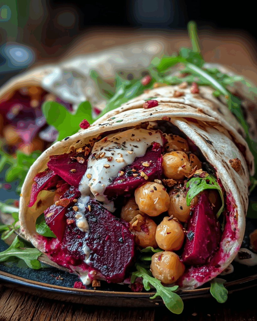 Earthy roasted beets and spiced chickpeas tucked into warm whole-wheat wraps with crisp greens and a silky tahini-lemon drizzle. Bright, satisfying, and totally meal-prep friendly.