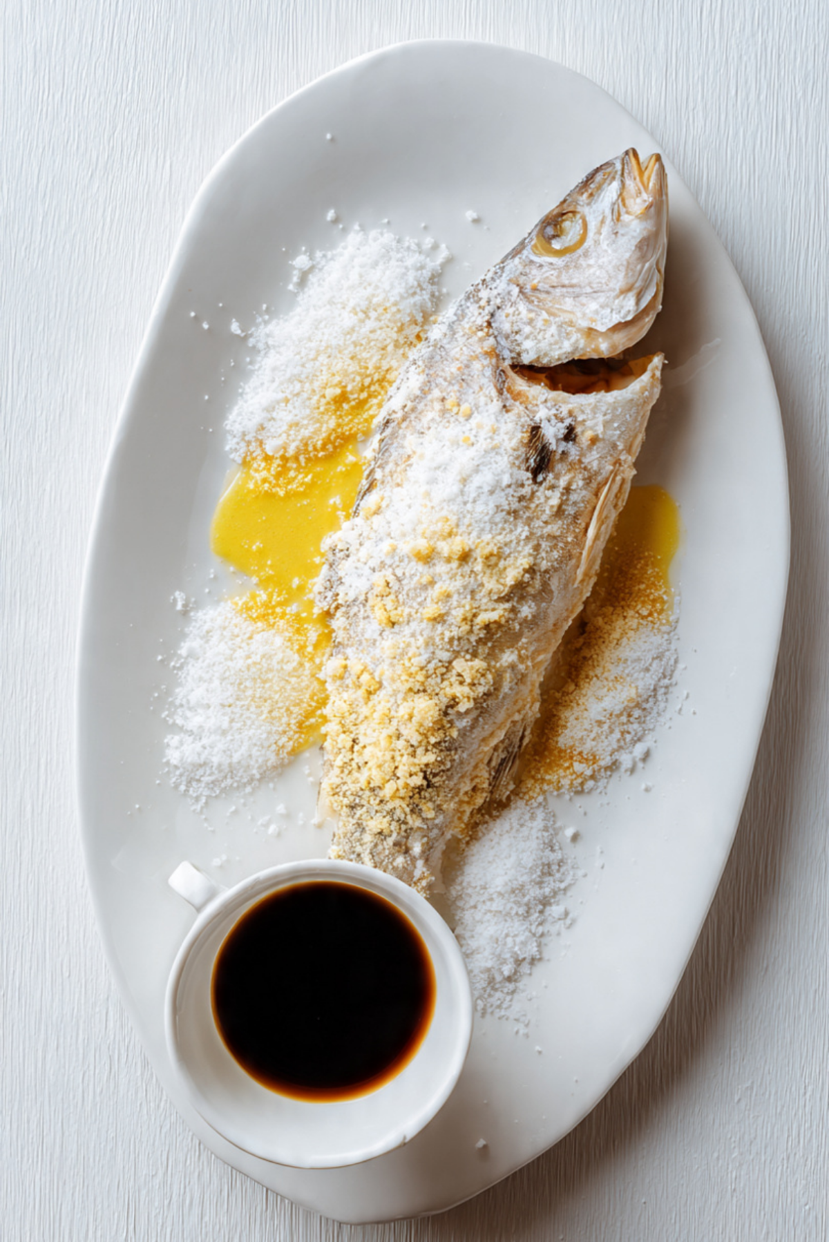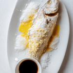 Crack the salt crust at the table for drama. Serve the sauce in a small elegant bowl on the side. Keep garnishes minimal so the golden crust and flaky white fish shine naturally.