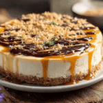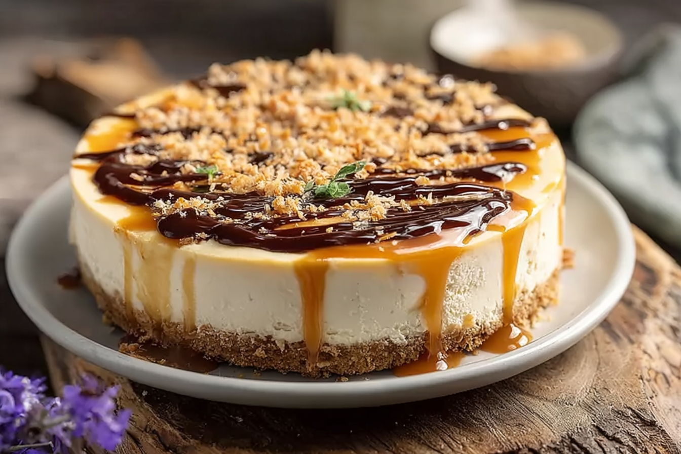 A luscious baked cheesecake inspired by the beloved Samoa cookie, layered with buttery graham crust, silky vanilla filling, ribbons of caramel, toasted coconut, and a glossy chocolate drizzle.