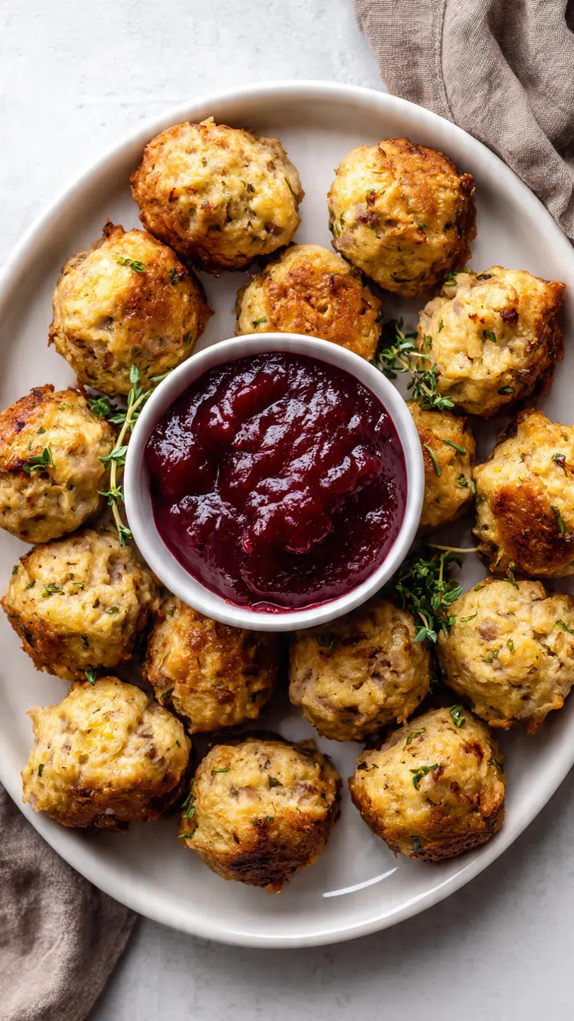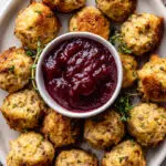Savory sausage stuffing bites baked until golden and served with sweet cranberry sauce for the perfect holiday appetizer.