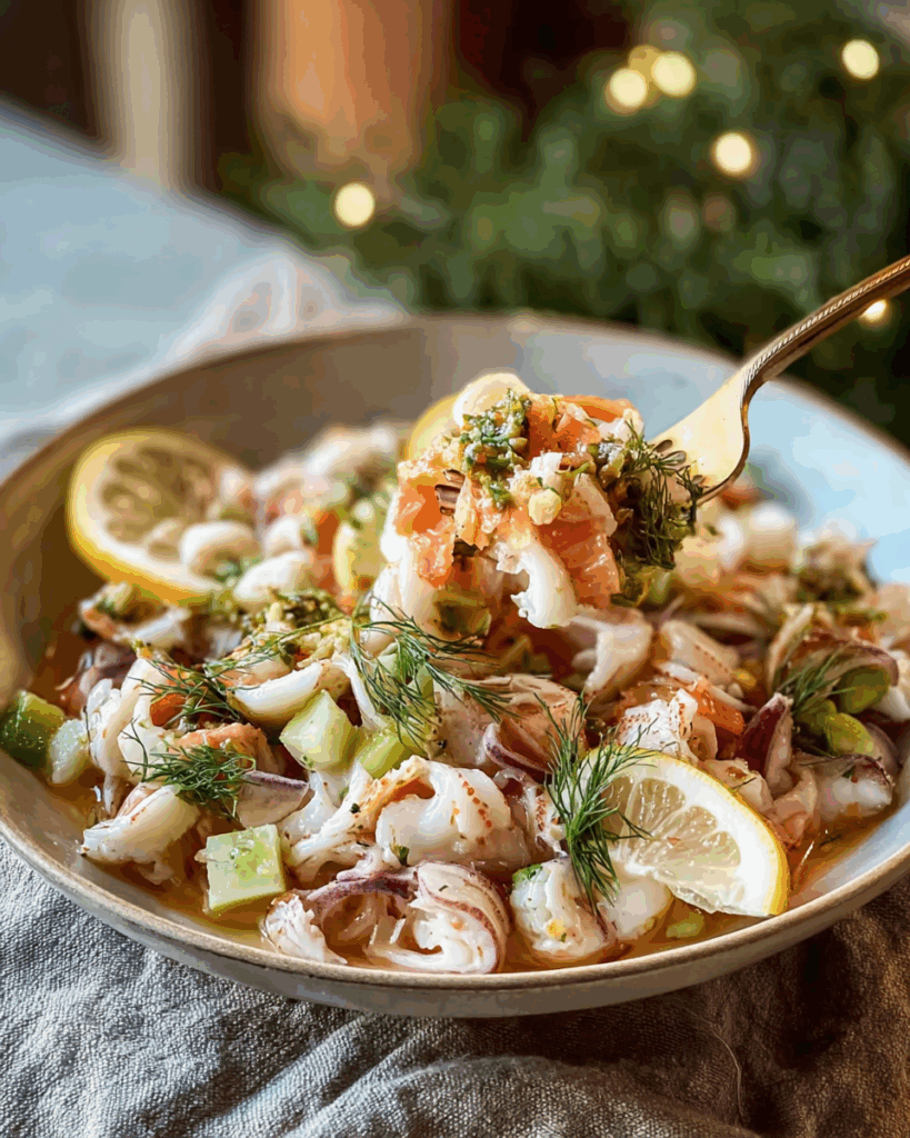 A festive Italian-American seafood salad featuring a colorful mix of seven seafoods tossed in a bright olive oil and lemon marinade, perfect for Christmas Eve or any celebratory meal.