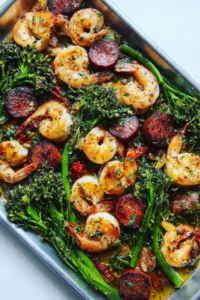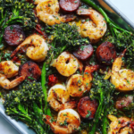 A bold and flavorful one-pan dinner featuring roasted shrimp, spicy chorizo, and broccolini, all caramelized to perfection with garlic, olive oil, and smoky paprika.