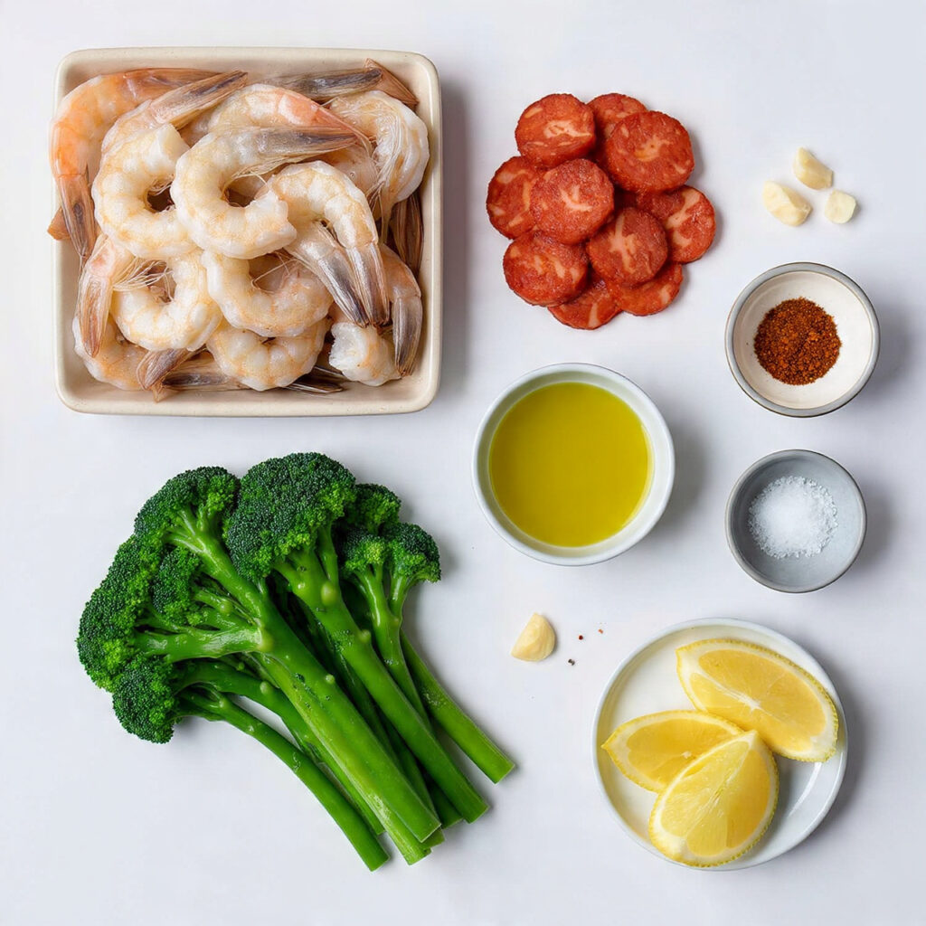 Ingredients in Sheet Pan Shrimp, Chorizo, and Broccolini