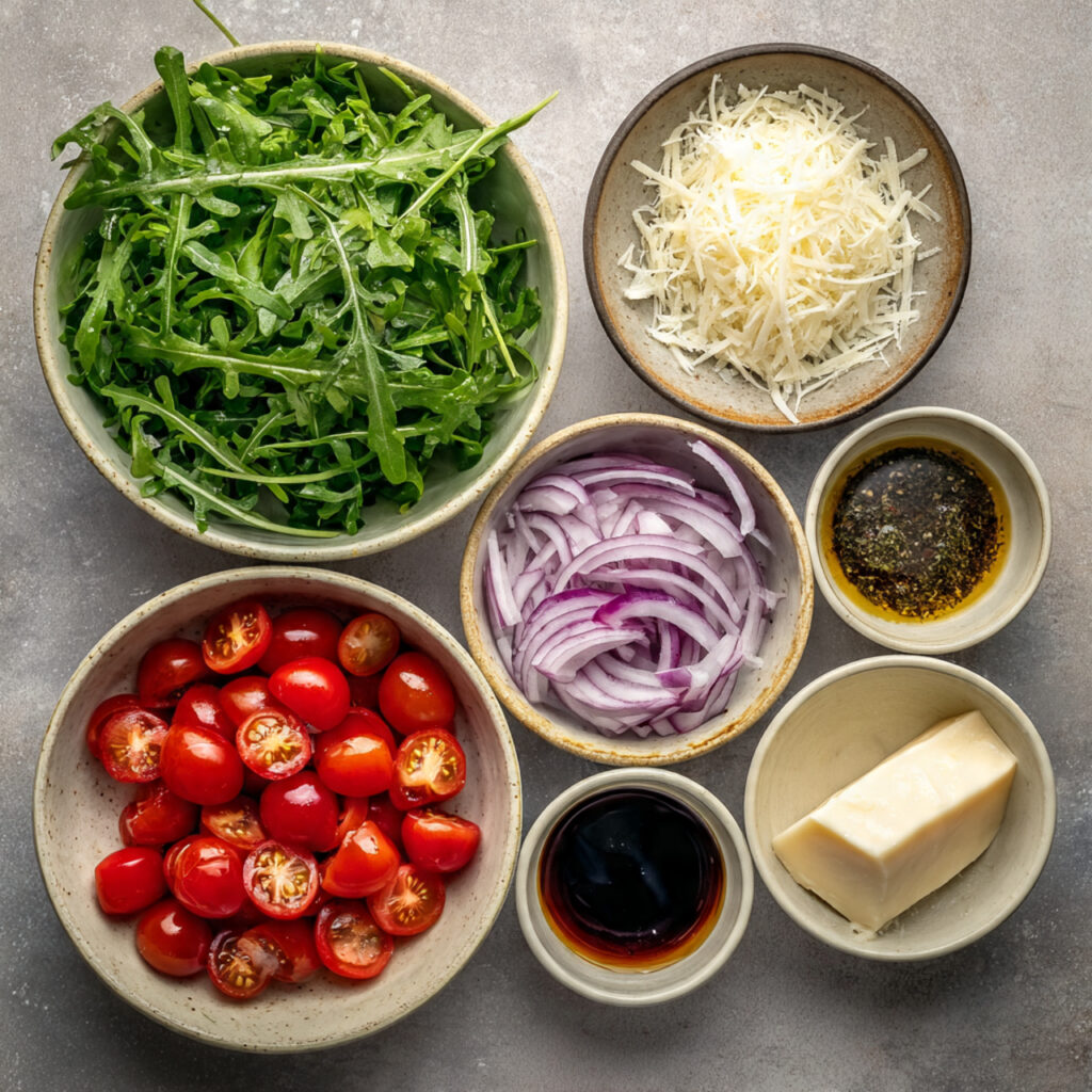 Balsamic Vinegar: Aged and slightly sweet, it enhances the natural bite of arugula and adds a rich depth to the dressing.