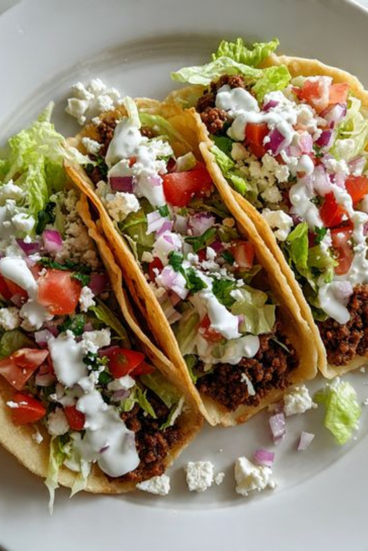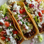 These Spiced Lamb Tacos are packed with bold flavor, featuring seasoned ground lamb tucked into warm corn tortillas and topped with crunchy lettuce, juicy tomatoes, tangy red onions, crumbled feta, and a refreshing yogurt drizzle.