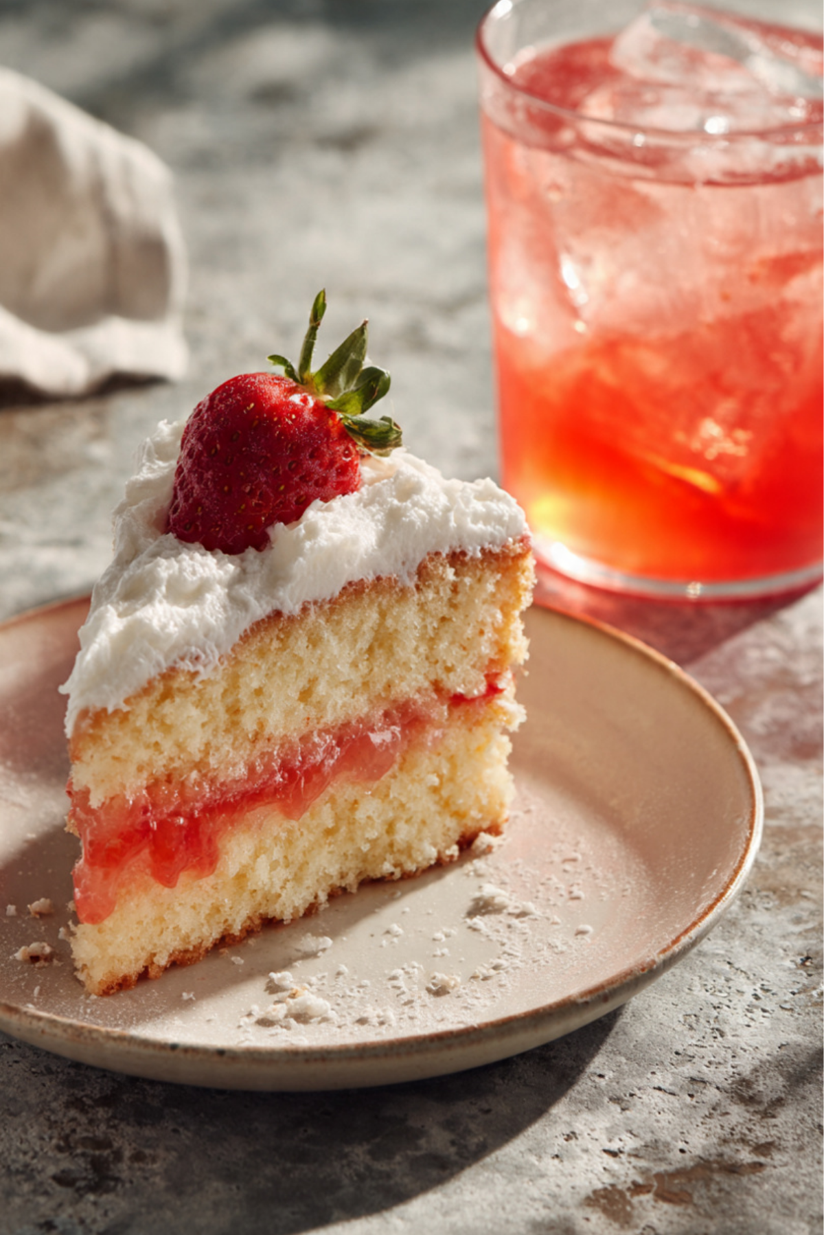 A light, fluffy sponge cake paired with a refreshing non-alcoholic strawberry daiquiri, perfect for summer treats or brunch gatherings.