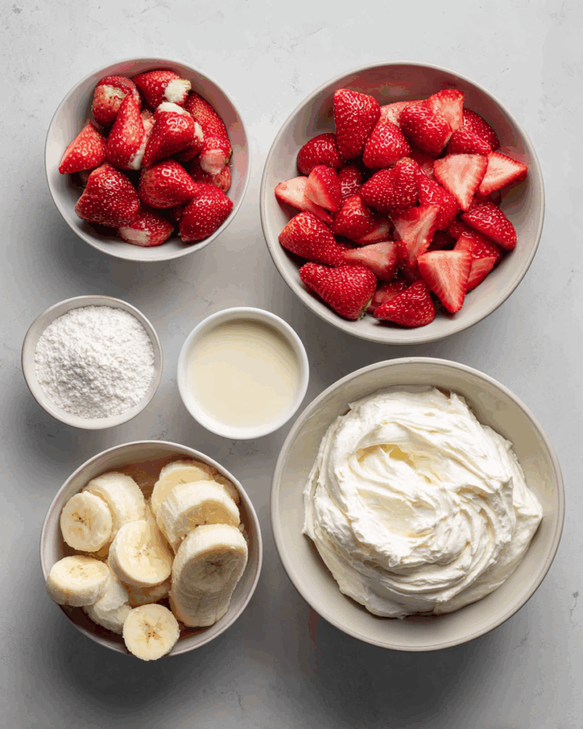 - Assemble the Dish: Add a layer of the cream mixture, followed by sliced strawberries and bananas. Repeat layers until the dish is filled.