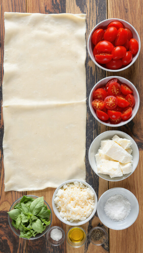 The crust is flaky and buttery, the cheese layer is creamy and savory, and the tomatoes are juicy and slightly caramelized from the oven. Basil adds a final fresh note that ties it all together.