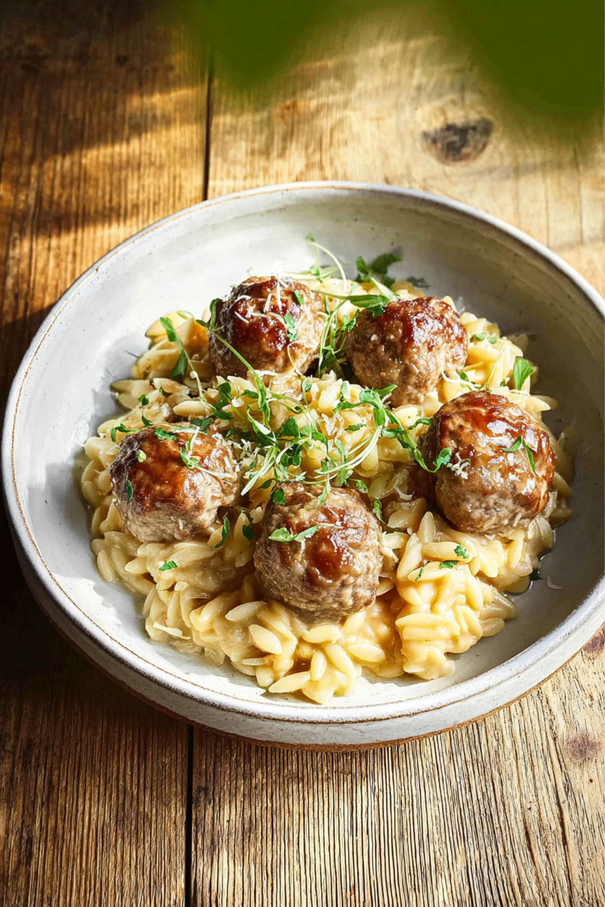 You’ll get juicy meatballs with a crisp‑golden exterior, nestled in orzo that has absorbed the beefy broth and melted cheese. The sauce is creamy but not heavy, the nutmeg adds subtle warmth, and finishing herbs brighten the whole dish.