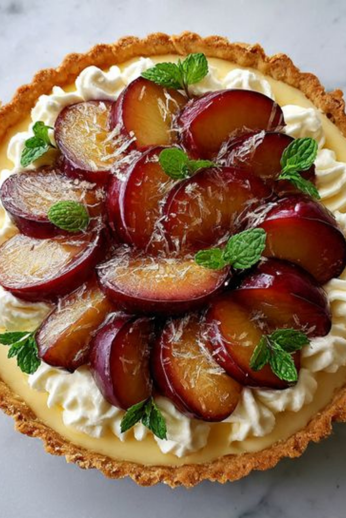 A stunning tart layered with almond custard, chantilly cream, and fresh ripe plums. This elegant dessert combines nutty, creamy, and fruity elements in perfect harmony.