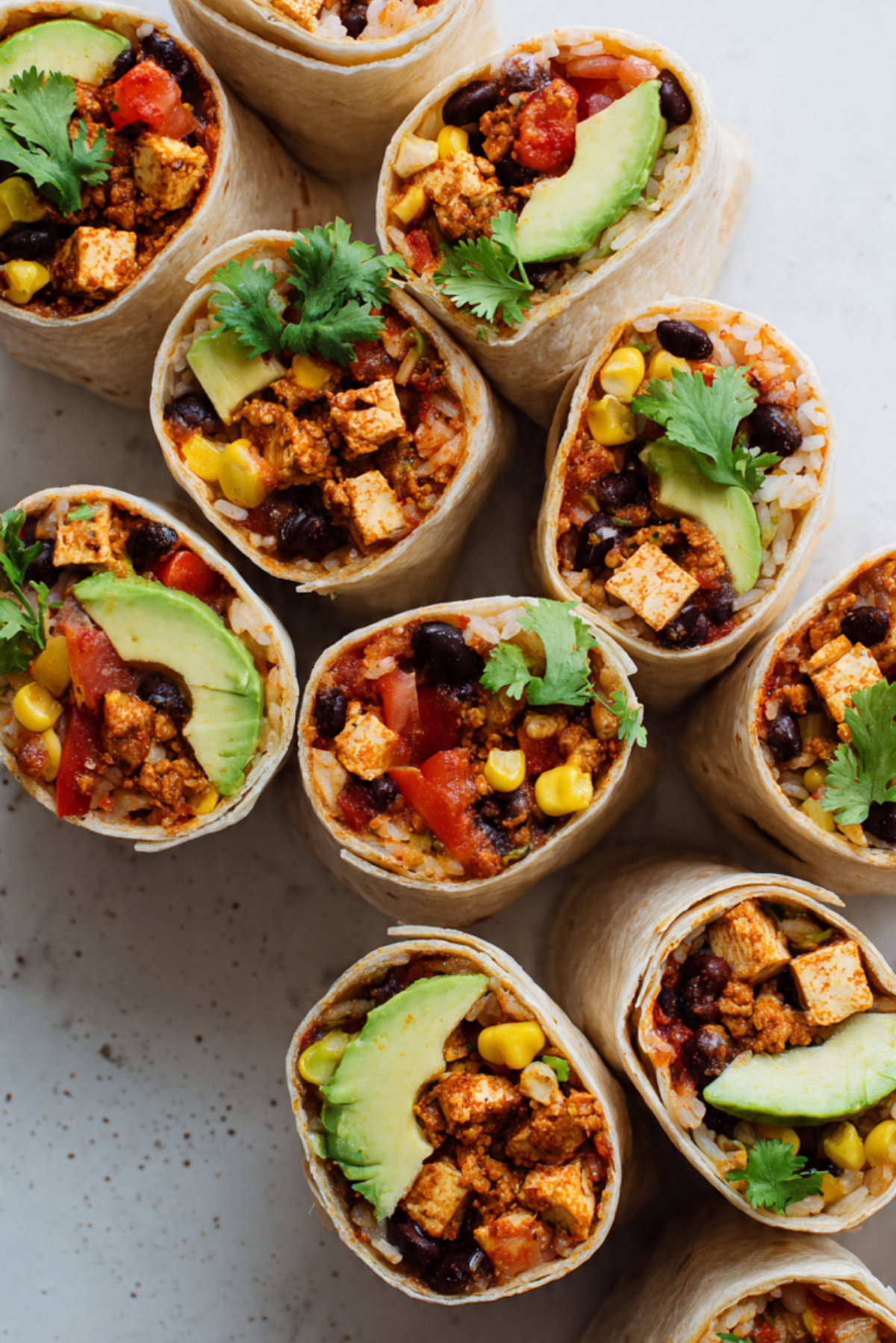 These tofu burritos are packed with seasoned crumbled tofu, fluffy rice, black beans, and fresh toppings, all wrapped in warm flour tortillas for a hearty and satisfying plant based meal.