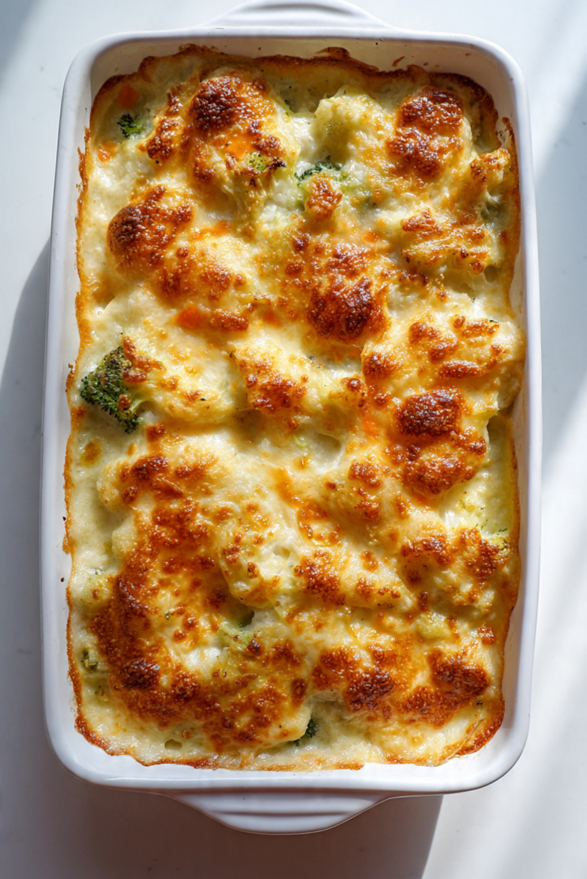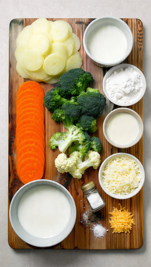 - Assemble the Dish: Layer potatoes, carrots, broccoli, and cauliflower evenly in the dish, pour over the cheese sauce, and sprinkle remaining cheddar and Parmesan on top.