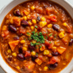 A cozy and hearty vegetarian pumpkin chili made with creamy pumpkin puree, two types of beans, tomatoes, warm spices, and sweet corn. This comforting one-pot meal is rich, satisfying, and perfect for chilly evenings.
