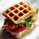 Crispy fried chicken layered between golden homemade waffles with fresh lettuce, tomato, creamy mayonnaise, and a drizzle of maple syrup. This sweet and savory sandwich delivers the perfect balance of crunch, juiciness, and fluffy texture in every bite.