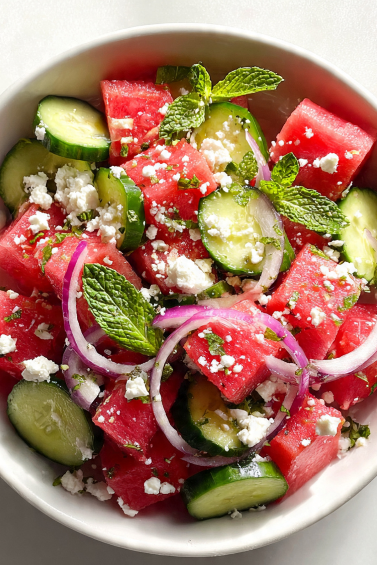 - In a large bowl, combine cubed watermelon, sliced cucumber, red onion, and crumbled feta.
