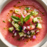 There’s something undeniably magical about a bowl of chilled soup on a hot day. And when that soup happens to be a vibrant, slightly sweet, slightly savory, refreshingly cool watermelon gazpacho, well, it’s like summer in a spoon. This dish is light, hydrating, and packed with layers of flavor that dance across your tongue — from the natural sweetness of watermelon to the subtle heat of jalapeño and the herbal brightness of mint and basil.