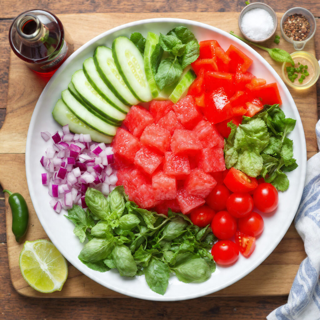 - In a large mixing bowl, add watermelon, cucumber, bell pepper, cherry tomatoes, red onion, basil, mint, jalapeño, lime juice, red wine vinegar, olive oil, salt, and black pepper.