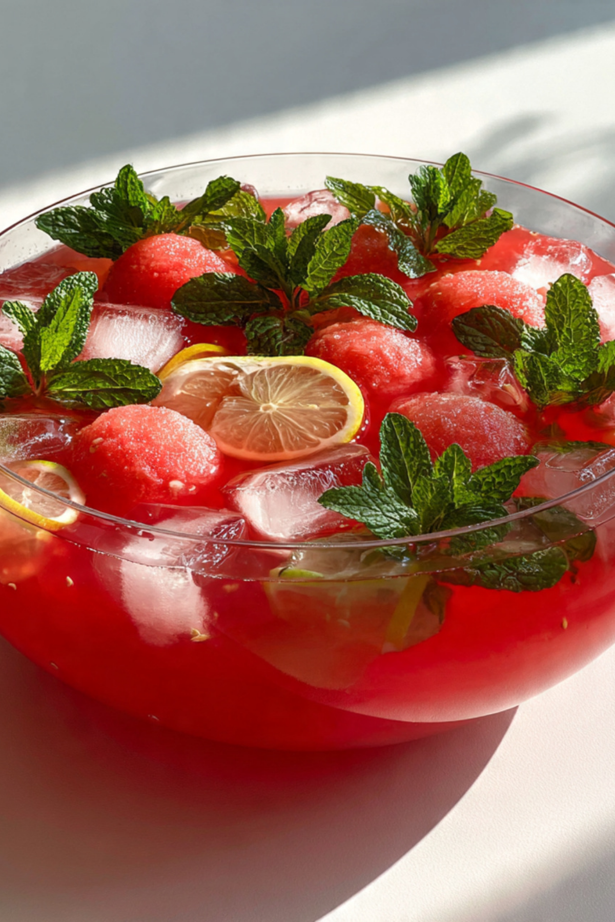 Presentation is everything here. Use a crystal-clear glass bowl, add plenty of ice and fruit on top, and serve on a tray with fresh herbs scattered around. A touch of sparkle goes a long way in making this punch the centerpiece of your summer table.